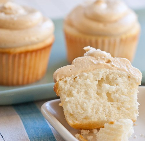 The Southern Foodways Alliance Community Cookbook. Now a word on these cupcakes: the recipe, as printed, is for a cake. But I’ve promised coworkers and friends I’d bring them treats this week so I wanted something more portable. The thing to know about this frosting: a) you can do it (go, go, go), b) the caramel is mind-blowing and c) as printed, it is so not acceptable for a cupcake. For a cake, it’s the kind of frosting that you pour over the top and spread around a bit and let it harden; for a cupcake, it’s just a flat, sticky mess. So I whipped up an American buttercream and simply added the majority of the caramel to it. The frosting is on the sweeter side, so if you’d prefer to make a simple cream cheese frosting and add the caramel to that, I think that would be fabulous. The good news is that the cupcake is not at all overly sweet, so it all works.